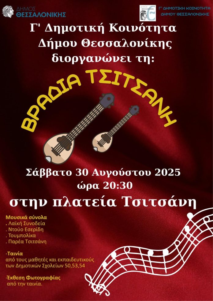 Δωρεάν Βραδιά Τσιτσάνη στην Άνω Πόλη: Η εκδήλωση- αφιέρωμα στον λαϊκό Έλληνα συνθέτη Βασίλη Τσιτσάνη πλαισιώνεται από μουσικά σχήματα της πόλης που παρουσιάζουν τραγούδια του συνθέτη, προβολή ταινίας από τους μαθητές και εκπαιδευτικούς των 50ου. 53ου και 54ου Δημοτικών Σχολείων καθώς και Έκθεση Φωτογραφίας.