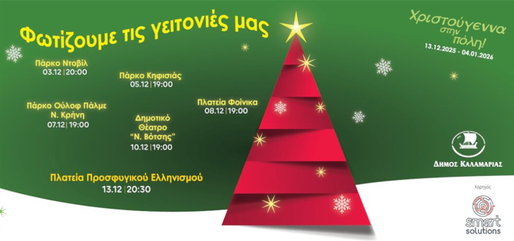 Οι εορτασμοί ξεκινούν με τα Ανάμματα των Χριστουγεννιάτικων Δέντρων σε όλες τις γειτονιές της Καλαμαριάς που θα κορυφωθούν με το άναμμα του δέντρου στην Πλατεία Προσφυγικού Ελληνισμού, αλλά και την πρώτη Λευκή Νύχτα στην πόλη μας!